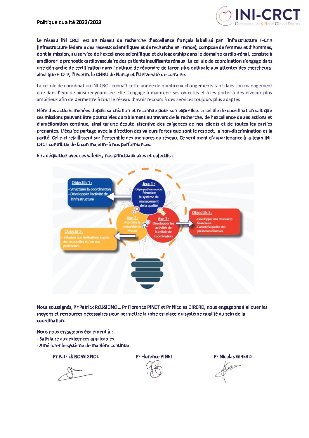 Le réseau INI-CRCT (Investigation Network Initiative – Cardiovascular and Renal Clinical Trialists) est un réseau français de recherche clinique d’excellence, créé en 2014 et labellisé par F-CRIN (French Clinical Research Infrastructure Network) en 2014. Cette labellisation a été renouvelée en 2019 et 2024. Elle est d’ores et déjà pérennisée. Coordonné par le Pr Patrick Rossignol, néphrologue et médecin vasculaire,  la cellule de coordination est basée à l’IRIS du CHRU de Nancy et certifiée ISO 9001 depuis 2018.
